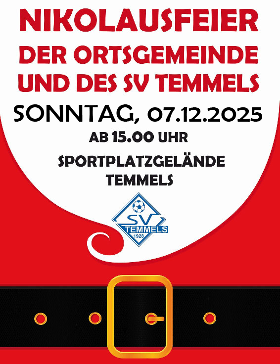 Alle Bürgerinnen und Bürger sind herzlich am Sonntag, den 7. Dezember auf den Temmelser Sportplatz eingeladen. Denn der Nikolaus kommt.