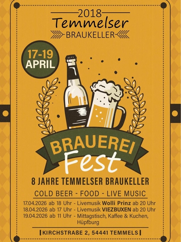 Vor acht Jahren öffnete der Temmelser Braukeller in der Kirchstraße 2 erstmals seine Pforten. Aus diesem Anlass wird vom 17. bis 19. April Geburtstag gefeiert. Los geht es am Freitag um 18 Uhr, am Samstag um 17 Uhr und am Sonntag um 11 Uhr.