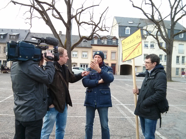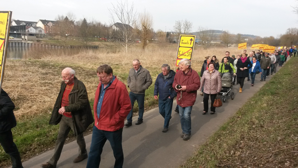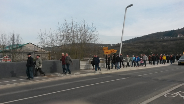 Der Protestzug startete als Sternmarsch auf deutscher Seite in Temmels und auf der luxemburgischen Seite in der Innenstadt von Grevenmacher. Beide Protestzüge trafen sich vor dem Kulturzentrum in Grevenmacher, wo auch die Abschlusskundgebung stattfand. Dort sprachen Léon Gloden, der Bürgermeister von Grevenmacher, und Karl-Heinz Frieden, Bürgermeister der Verbandsgemeinde und der Stadt Konz, zu den Teilnehmern.