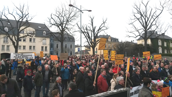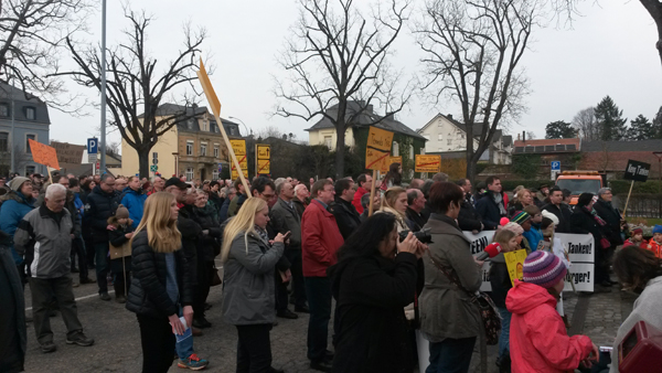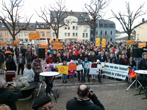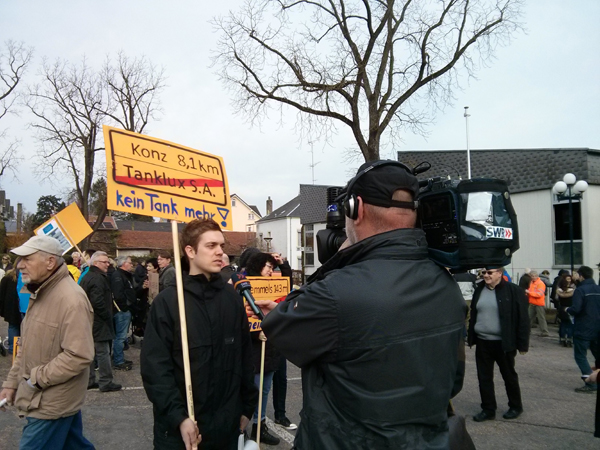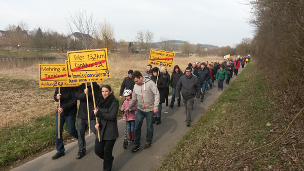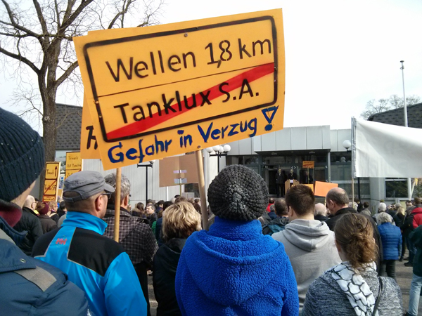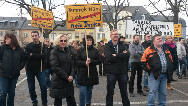 Rund 600 Teilnehmer aus vielen Gemeinden beiderseits der Mosel haben in Grevenmacher gegen die Erweiterung des Tanklagers im Merterter Hafen protestiert. Es ist geplant die Kapazität von 60.000 auf 150.000 Kubikmeter zu erhöhen. Zusätzlich zu Öl und Benzin soll nun auch Kerosin eingelagert werden.