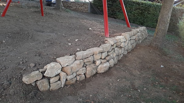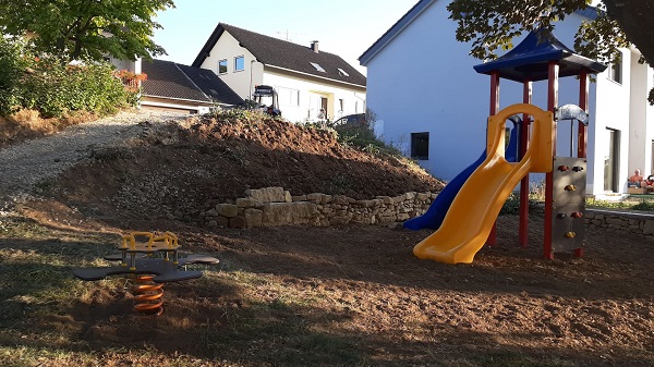 Beim letzten Arbeitseinsatz wurden Trockenmauern aus Bruchsteinen errichtet und Schotterarbeiten durchgeführt. Diesmal soll der Hang oberhalb der Spielplatzes mit essbaren Sträuchern und Kräutern bepflanzt werden.