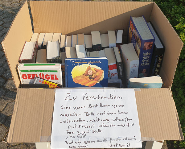 Um in Zeiten geschlossener Bibliotheken frischen Lesestoff anzubieten, gibt es an vielen Stellen bei uns im Ort von Anwohnern vor ihren Haustüren aufgebaute Tische mit Büchern zum Verschenken.