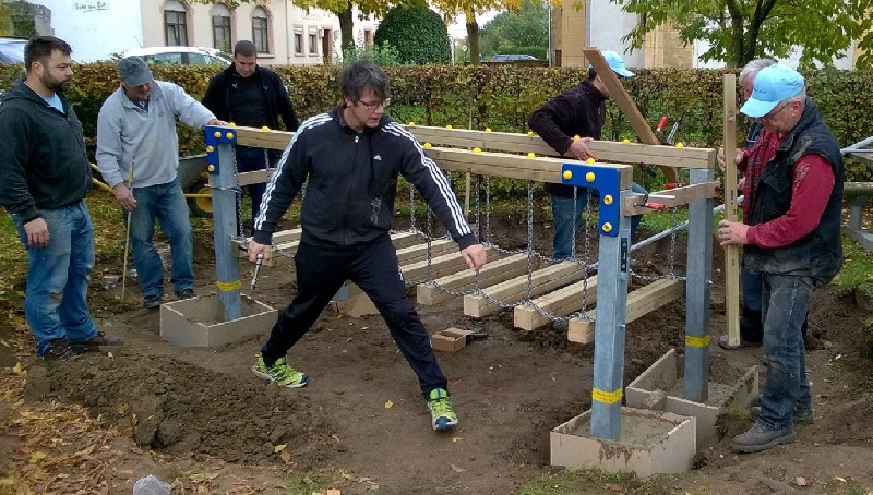 Damit die Spielgeräte sicher befestigt sind, wurden Löcher ausgehoben, in denen die Stützen fest einbetoniert wurden. Vorher mussten natürlich noch die Einzelteile verbunden und alles ausgerichtet werden ... mehr | |  |