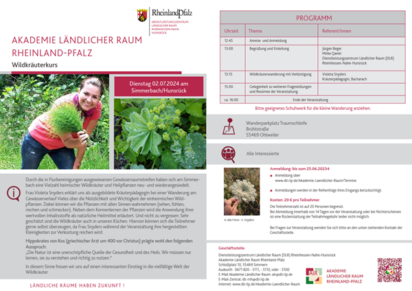 Hiermit weisen wir auf die kommende Veranstaltung der Akademie Ländlicher Raum Rheinland-Pfalz zu dem Thema "Wildkräuterkurs" am Dienstag, 02. Juli 2024 von 12:45 Uhr bis ca. 16:00 Uhr am Simmerbach in Ohlweiler hin.
