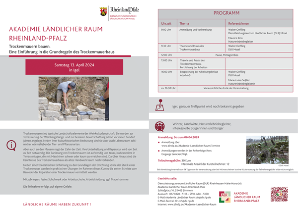Hiermit weisen wir auf die kommende Veranstaltung der Akademie Ländlicher Raum Rheinland-Pfalz zu dem Thema "Trockenmauern bauen - Eine Einführung in die Grundregeln des Trockenmauerbaus" am Samstag, 13. April 2024 jeweils von 9.00 Uhr bis ca. 16.30 Uhr in Igel hin.